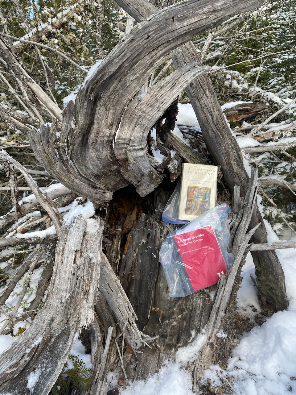 DÉCEMBRE 2023. Un retour après un long . Mais la bibliothèque a survécu grâce aux bons soins de Diégo le Découvreur. Deux nouveaux bouquins espèrent une rencontre féconde avec le territoire.